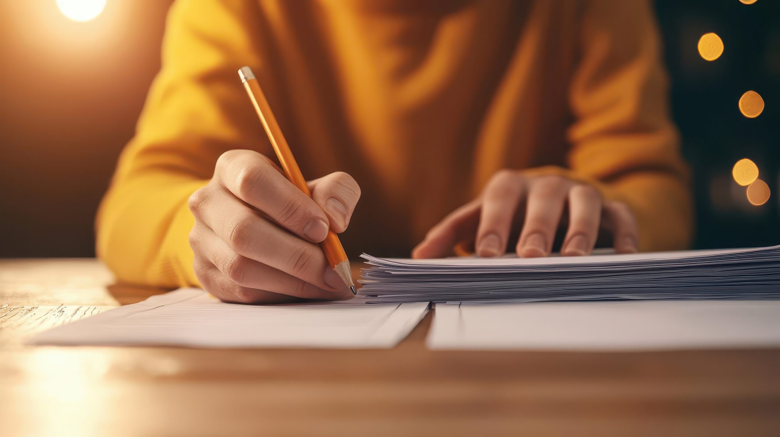 Teacher grading papers late at night, providing detailed feedback to help students improve, perseverance, determination, patience