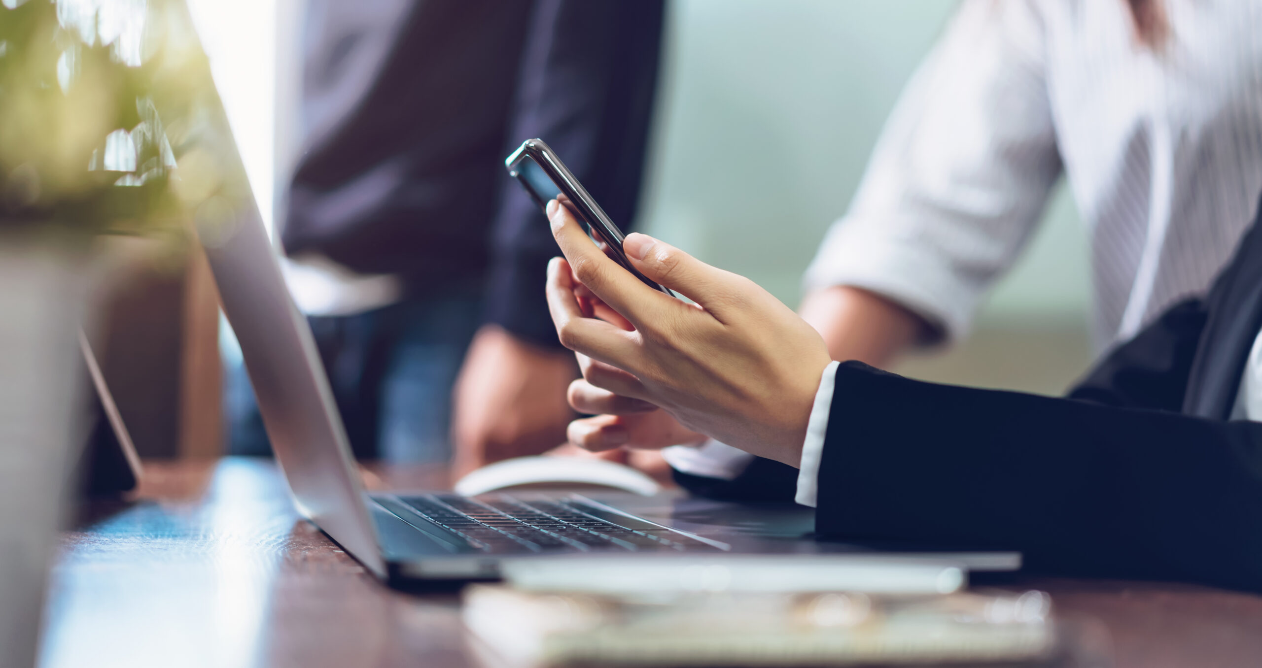 Business woman holding smartphone, using cell phone on office. Technology for communication concept.