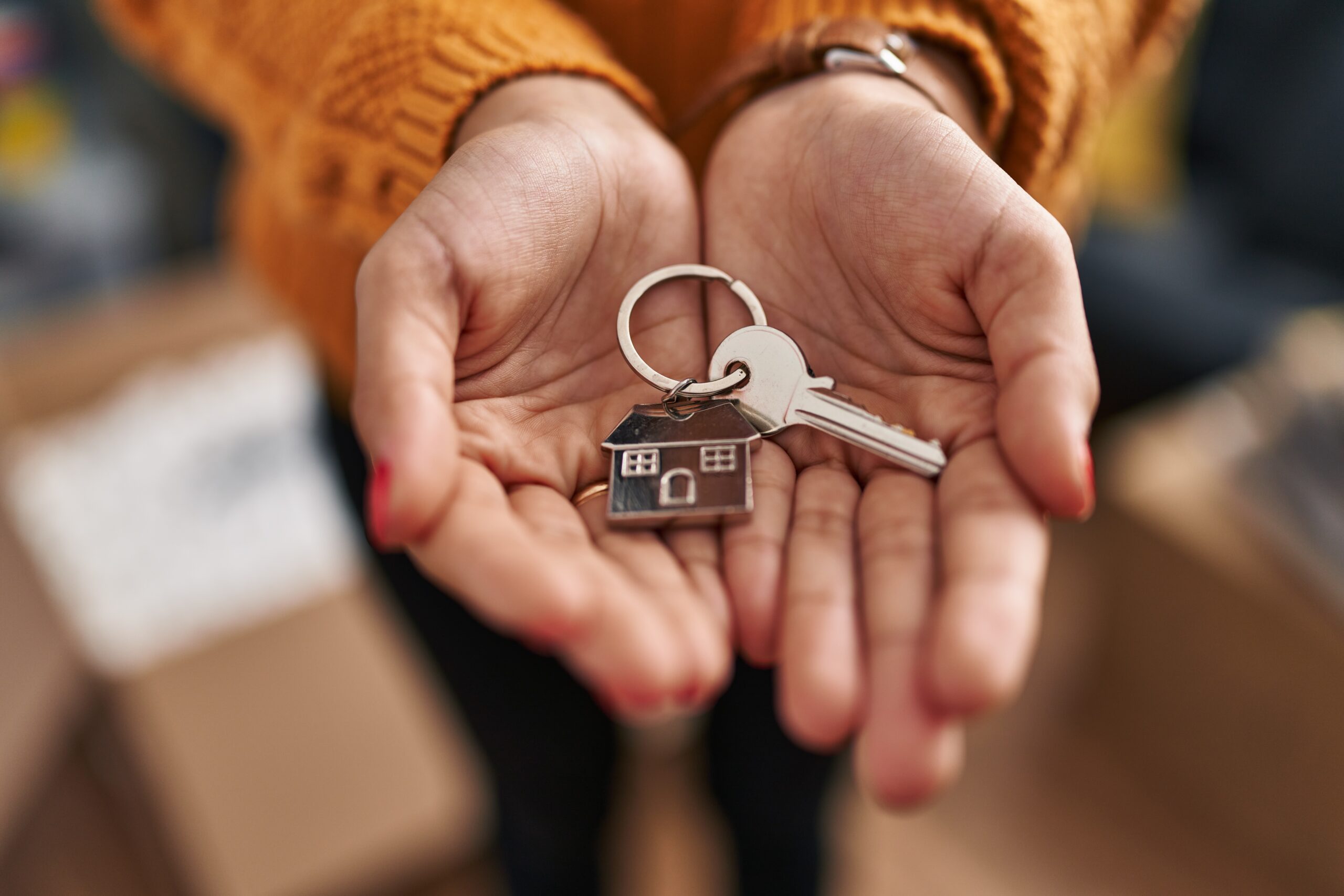 Young latin woman holding key of new house at new home